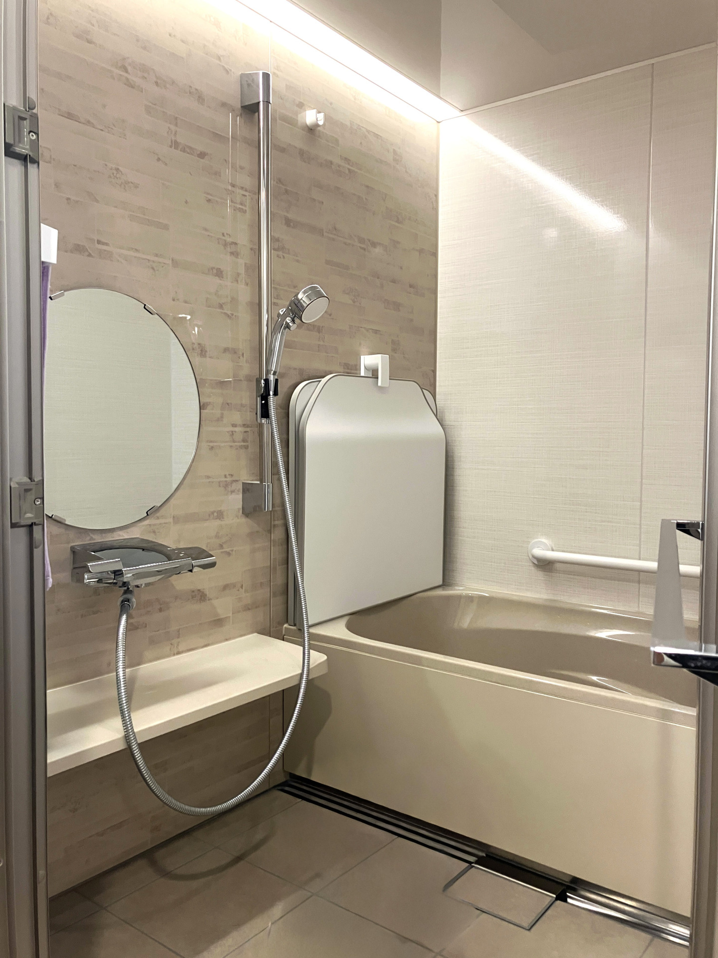 浴室は、肩を包み込むツイン水流とジェットバスが心も体も癒してくれます。柔らかなベージュ調のアクセントパネルに、空間をスッキリと見せるライン照明を採用し。まるでスパのような特別な空気感を演出しています。