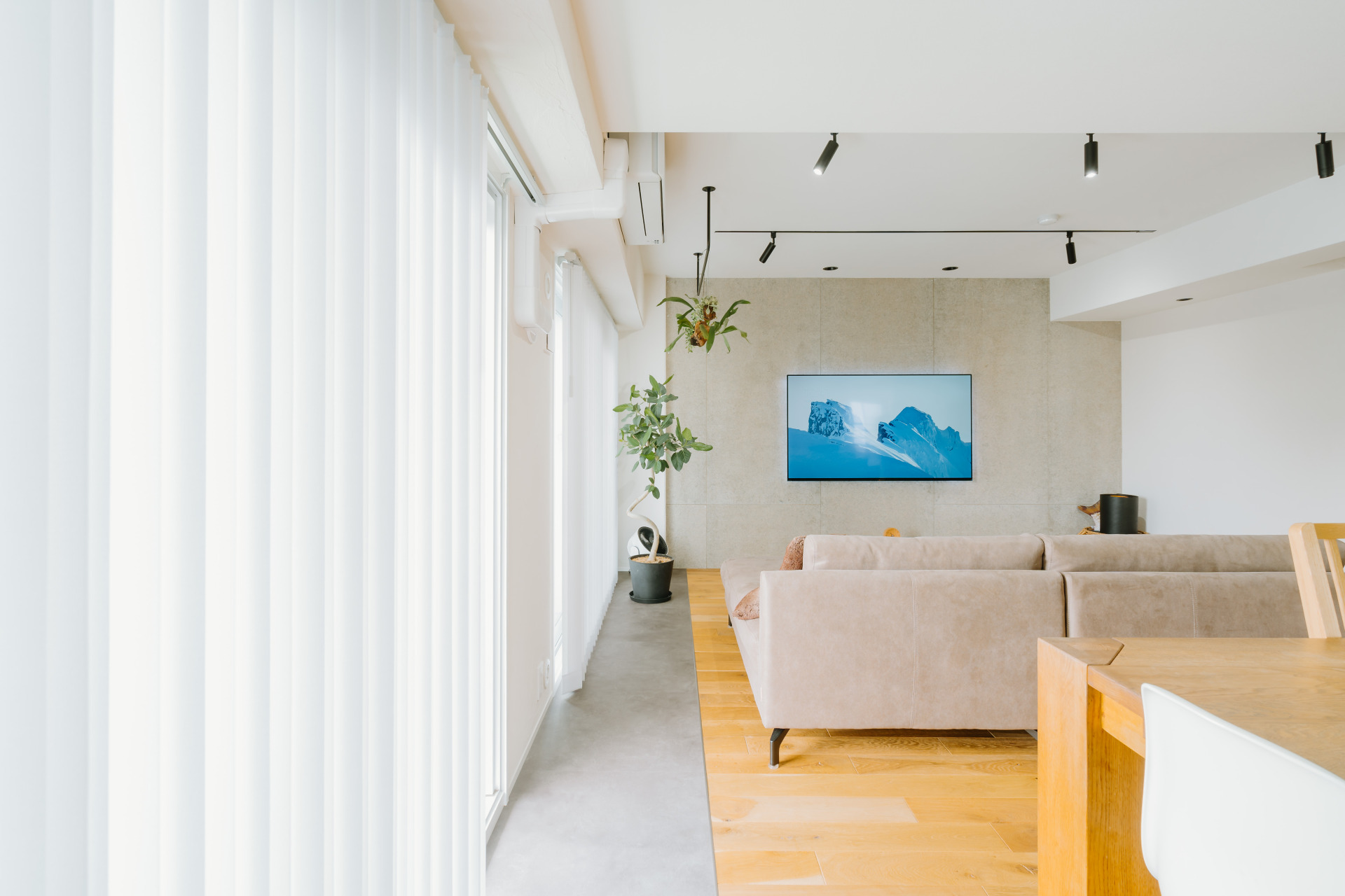 「子どもたちの成長にあわせて、家族がのびのびと暮らせる家にしたい」 そんな思いから、階層のあるメゾネット物件へ住み替えを決断されたA様ご夫妻。今回のリノベーションでは、それぞれの個室を設けた4LDKプランをベースに、生活動線や使い勝手にもこだわりました。 LDKには、家族で使えるカウンタースペースを設置。キッチンは奥様ご希望の対面式にし、家事のしやすさと会話のしやすさを両立させています。また、食材や調理道具をすっきりと収められるパントリーも新設しました。 「収納はなるべく“見せたくない”」というお考えから、収納スペースはまとめて隠せるよう設計し、空間全体が整って見える工夫をプラス。 ご主人は以前、仕事のために外部のワークスペースを借りていたそうですが、今回のリノベで個室を設け、自宅でのリモートワークができる環境に。また、「犬を飼いたい」という未来を見越し、帰宅後すぐ足を洗える動線も考慮しています。 さらに、天井はコンクリートの躯体現し仕上げをご希望されており、デザイン性と素材の質感を重視した空間に。