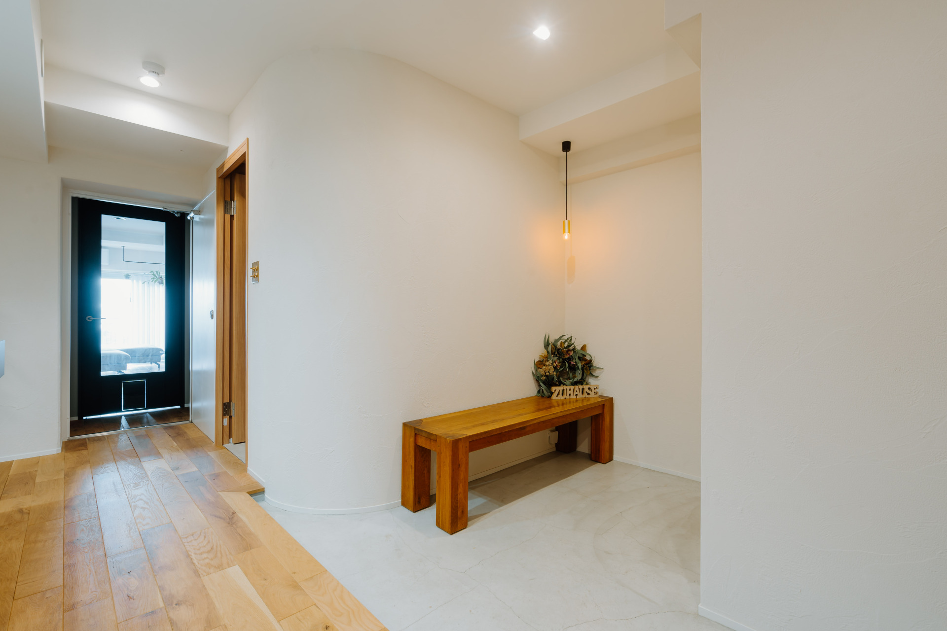 リノベーションの方向性を固める前に、実際の現場を2件ほどご見学いただきました。特に今回は“チャレンジングな素材選び”が多かったため、「この素材で空間がどう変わるのか?」というイメージを持っていただくためにも、丁寧な打ち合わせと体験ベースの検討を重ねました。 特に印象深かったのは、キッチンの配管にまつわるお話。対面式への変更をご希望だったため、排水経路の確保に伴って床を上げる必要があり、その点をとても気にされていました。実際に配管経路を見られる現場見学会をご案内し、不安を解消していただいた上でご納得いただけたことが嬉しかったです。 もうひとつの印象的なポイントは、玄関ホールのデザイン。玄関入ってすぐの洗面台や、R壁で緩やかに仕切られたゾーニング、モルタルで仕上げた土間など、まさに“おもてなしの入口”にふさわしい空間が完成しました。間接照明を組み合わせた照明計画も含め、訪れる人の記憶に残るエントランスになったのではないかと思います。