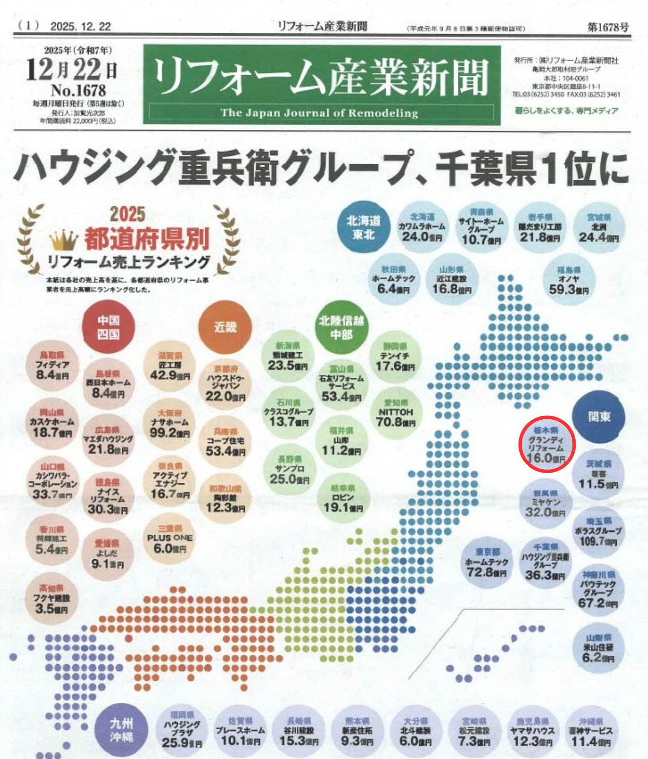 リフォーム産業新聞 都道府県別リフォーム売上ランキング【8年連続栃木県1位】を獲得しました。