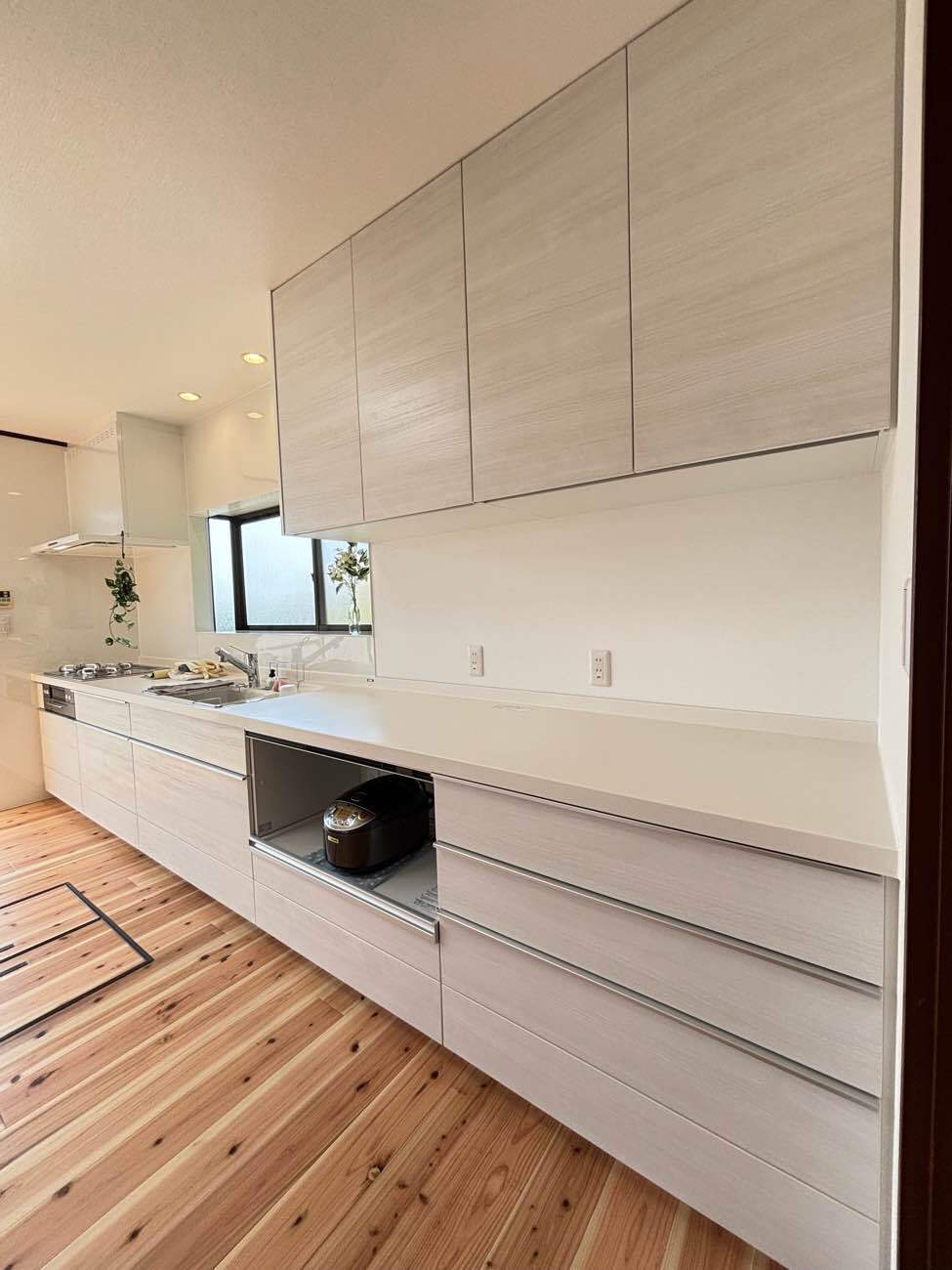 広く開放的なキッチンになり、料理をする時間が楽しいひと時になりました。子のキッチンで孫とクッキーを焼く日が待ち遠しいです。キッチンの交換だけを考えていましたが、台所と居間を一つの空間にするご提案をしていただけて、今回リフォームをしてよかったです。