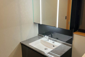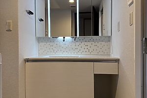 元々あった洗面所のガラス棚が付いたキャビネットを残したく、イトケンさんに相談したらキャビネットはダイニングに移動することに。