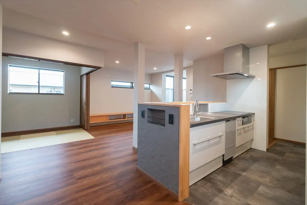 築30年の母屋を増築し、完全分離型の二世帯住宅へフルリフォームした事例です。ゆったりとくつろげる空間作りを意識し、リビングには畳のスペースを作りました。