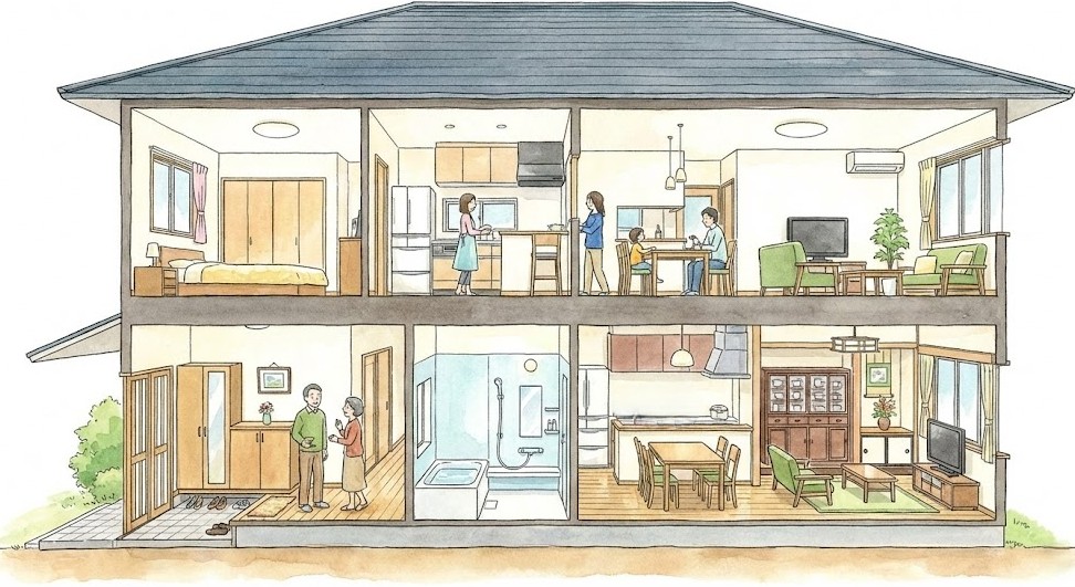 玄関・キッチン・浴室・トイレなど、どの設備を共有で使うかは両世帯で話し合って決めましょう。食事を一緒にとるかどうかによっても、キッチンやリビングの使い方は変わってきます。