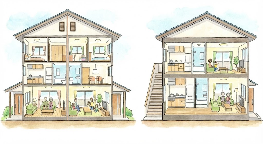共有のスペースを持ちつつ、各世帯だけで過ごせる空間も持ちたいときに適しています。共有スペースの割合や、どの設備を共有にするかは自由に決められるので、両世帯で話し合いながら決めると良いでしょう。
