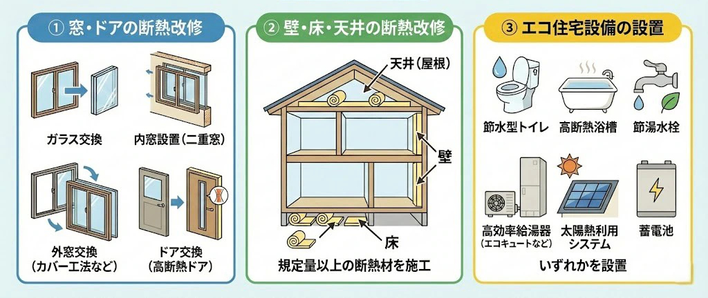 以下の①〜③のいずれか1つ以上の工事を行う必要があります。