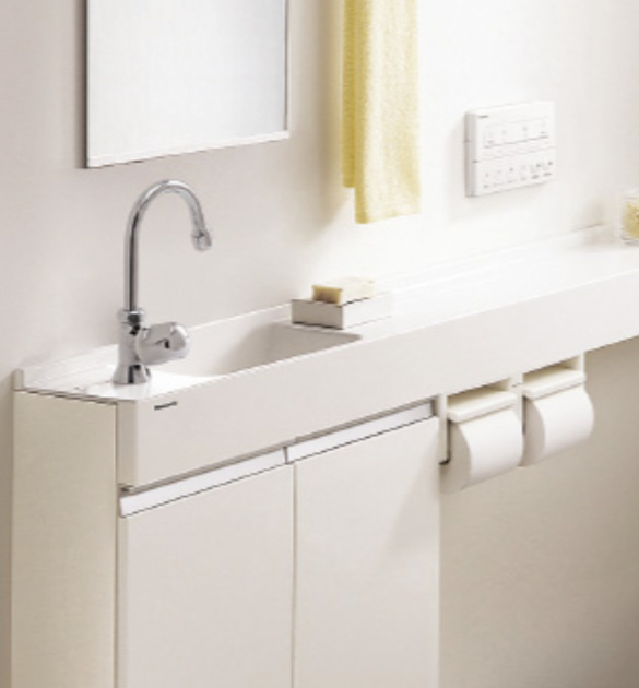 アイカ工業の「スマートサニタリーミュゼ」は、造作風のデザインとコンパクトな機能性を両立させたトイレ向け手洗いカウンターです。
